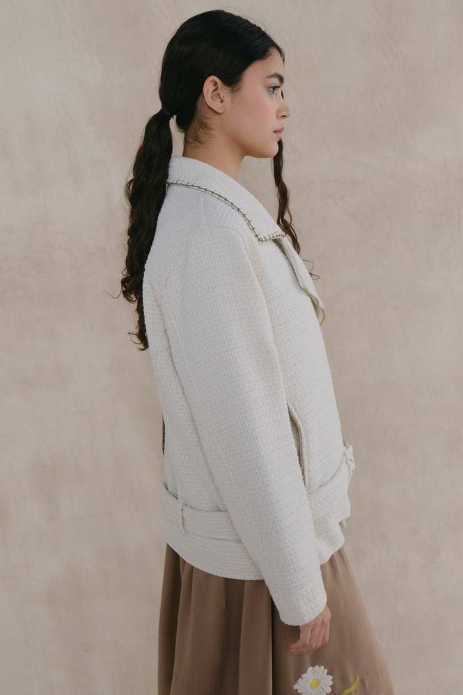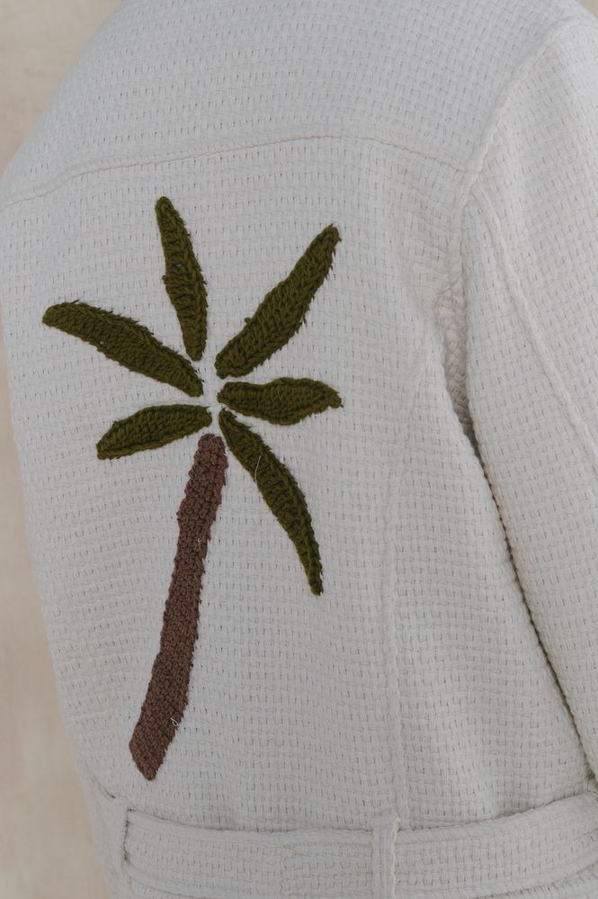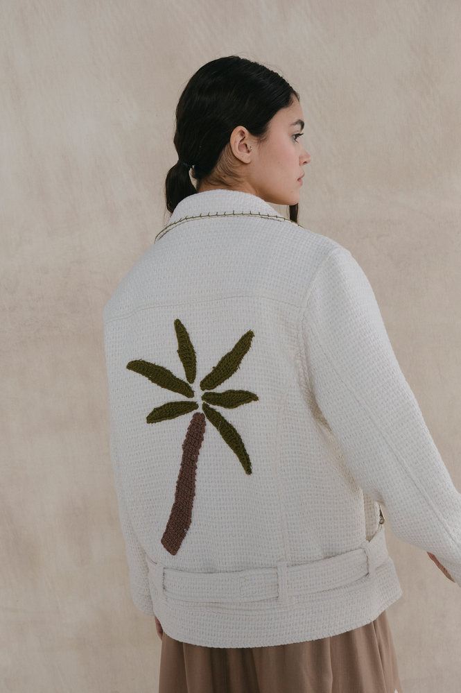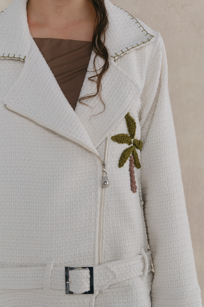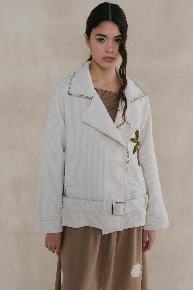 Campera biker de algodón con solapas y detalles bordados a mano y apliques de crochet. Fit semi oversized. Cierre frontal metálico y cinturón con herrajes personalizados. Composición exterior: 100% algodón. Forrería: 100% viscosa. Esta prenda está intervenida a mano, por lo que puede variar ligeramente de la foto. Cada pieza es única, reflejando 'La magia de lo irrepetible'."