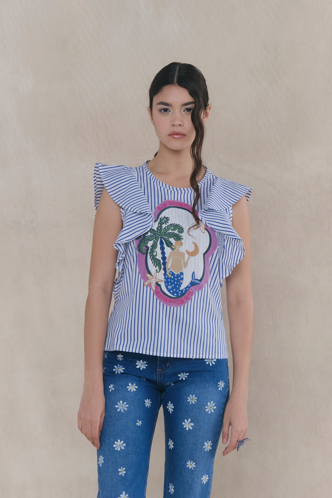 Blusa con detalle de volado en manga y bordado protagonista exclusivo de la colección OCEANICA SS26. Fit recto, largo a la primera cadera. Acceso mediante gota en espalda y botón personalizado. Composición por 100% algodón. Limpieza y Cuidados: lavar a mano, secar del revés, no planchar sobre el bordado