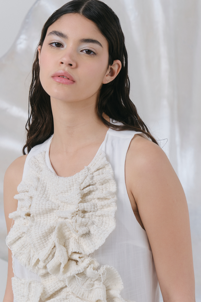 Blusa con escote redondo y detalle de volado en forma de caracol en tela texturada. Una prenda de diseño con cierre metálico y avíos personalizados. Fit recto, largo a la primera cadera. Compuesta por lino con spandex y aplique de algodón 100%. Cuidados: lavar a mano, no retorcer, planchar volado con vapor