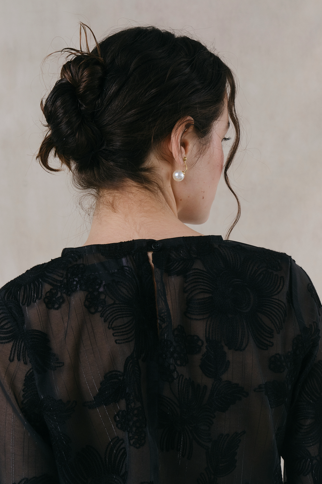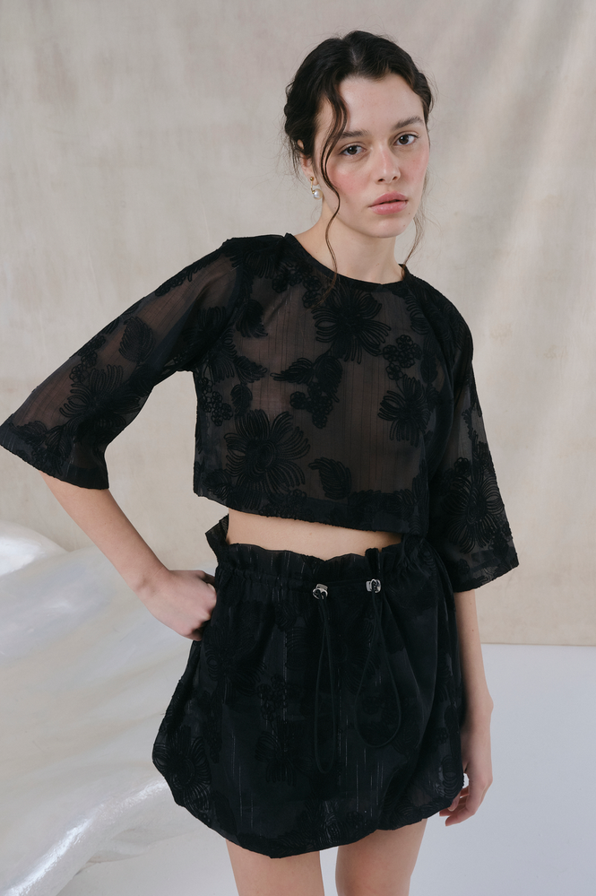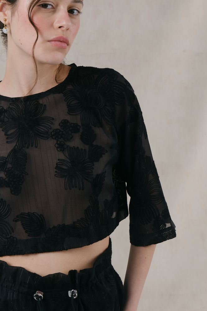 Blusa con manga al codo y escote redondo, confeccionada en organza bordada en hilo. Acceso mediante gota en espalda y botón personalizado. Fit recto de largo cropped. Ideal para combinar con otras prendas de la familia Amara. Compuesta por 100% poliéster. Cuidados: lavar a mano con agua fría, no retorcer, colgar del revestimiento, planchar con plancha tibia.