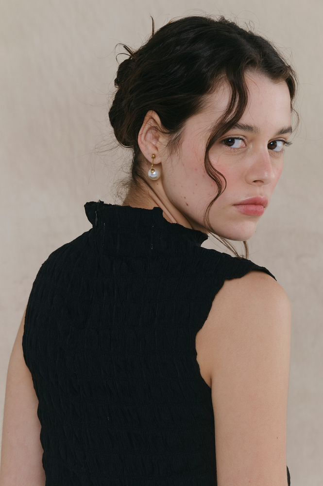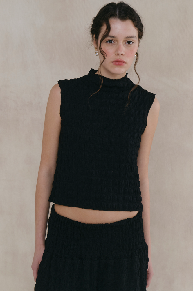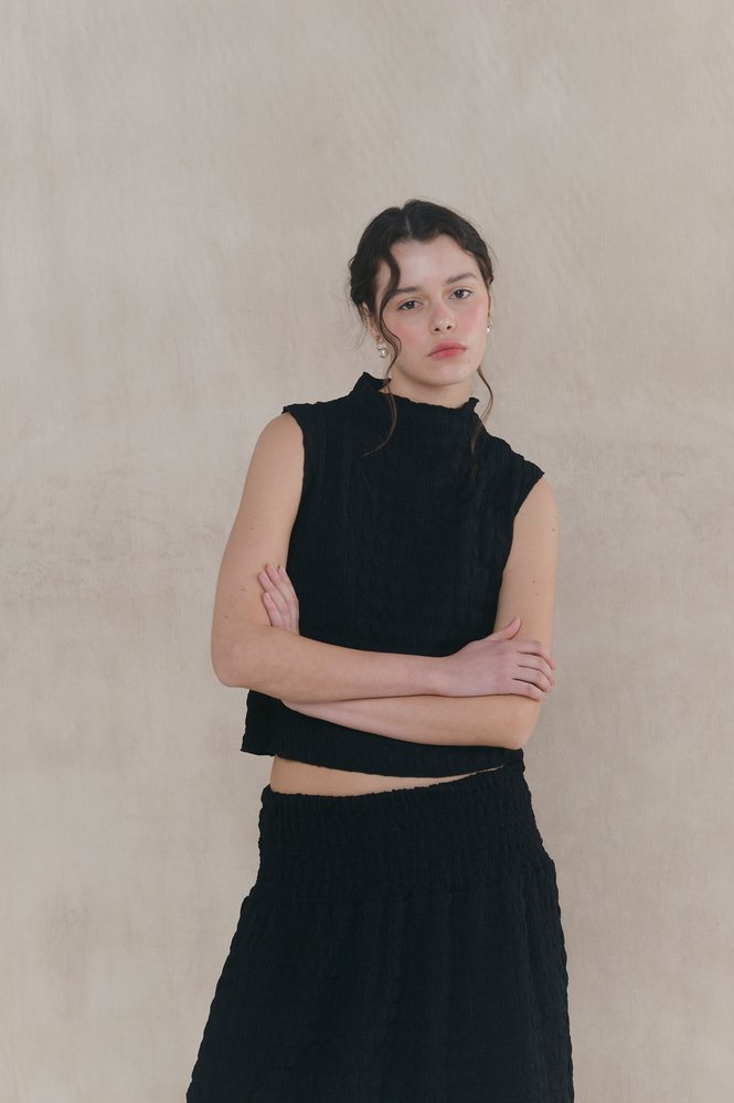 Top musculosa con escote y ruedo terminación rulotte, confeccionada en cloque. Ideal para combinar con falda Caleidoscopic. Fit al cuerpo. Composición por 100% poliéster. Limpieza y Cuidados: lavar a mano, no retorcer, no blanquear, no planchar