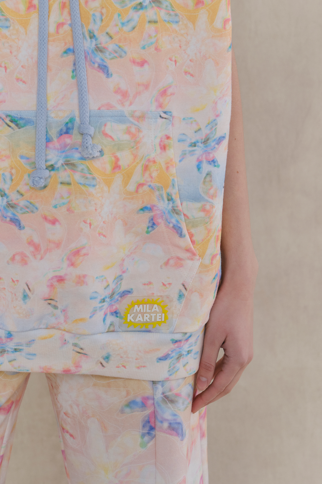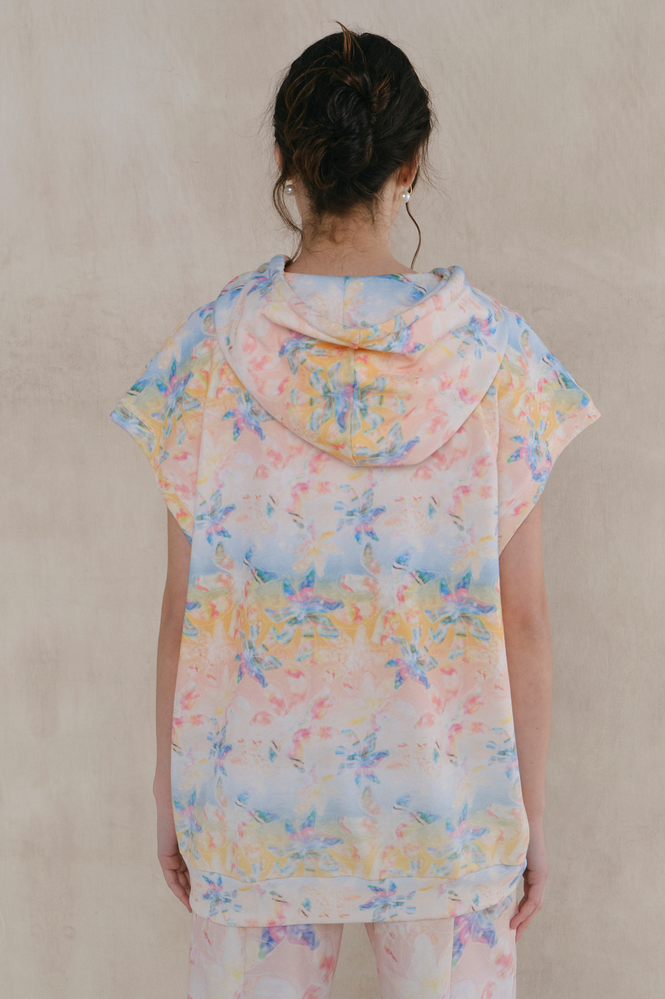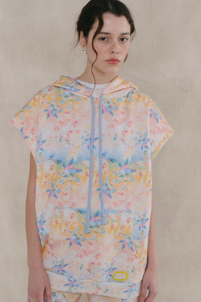 Sudadera tipo poncho de algodón estampado digitalmente con ilustración exclusiva. Fit oversized. Capucha y bolsillos frontales. Etiqueta personalizada con toque deportivo. Ideal para combinar con pantalón Lúdic y lograr un total look relajado perfecto para una tarde en la playa. Composición: 100% algodón.