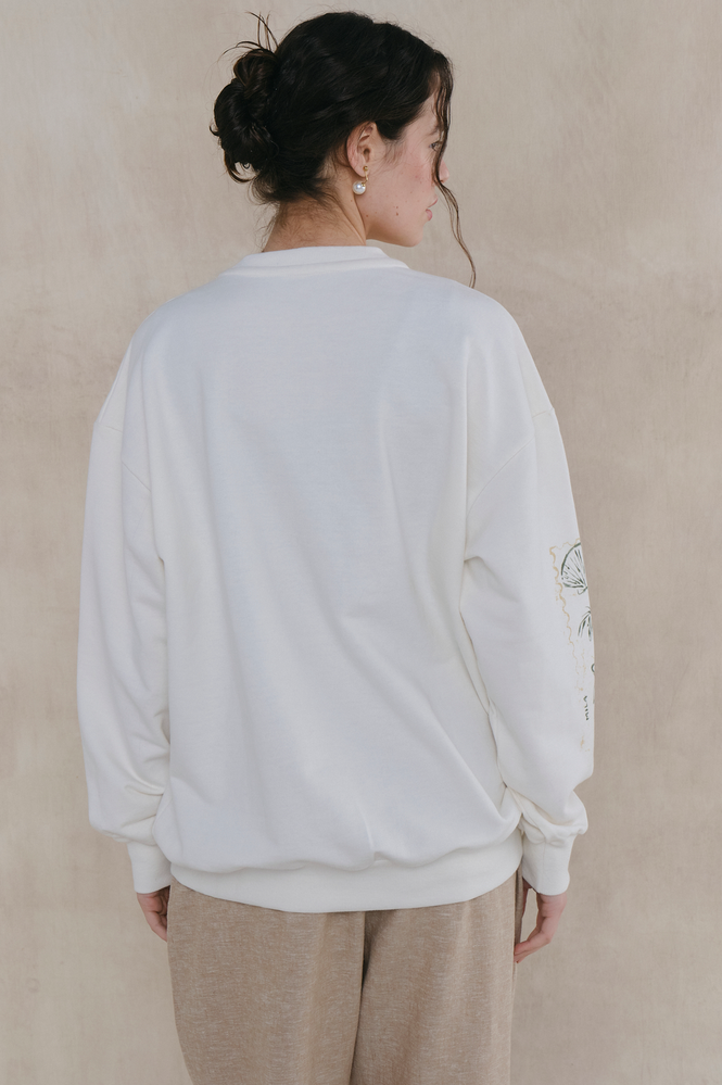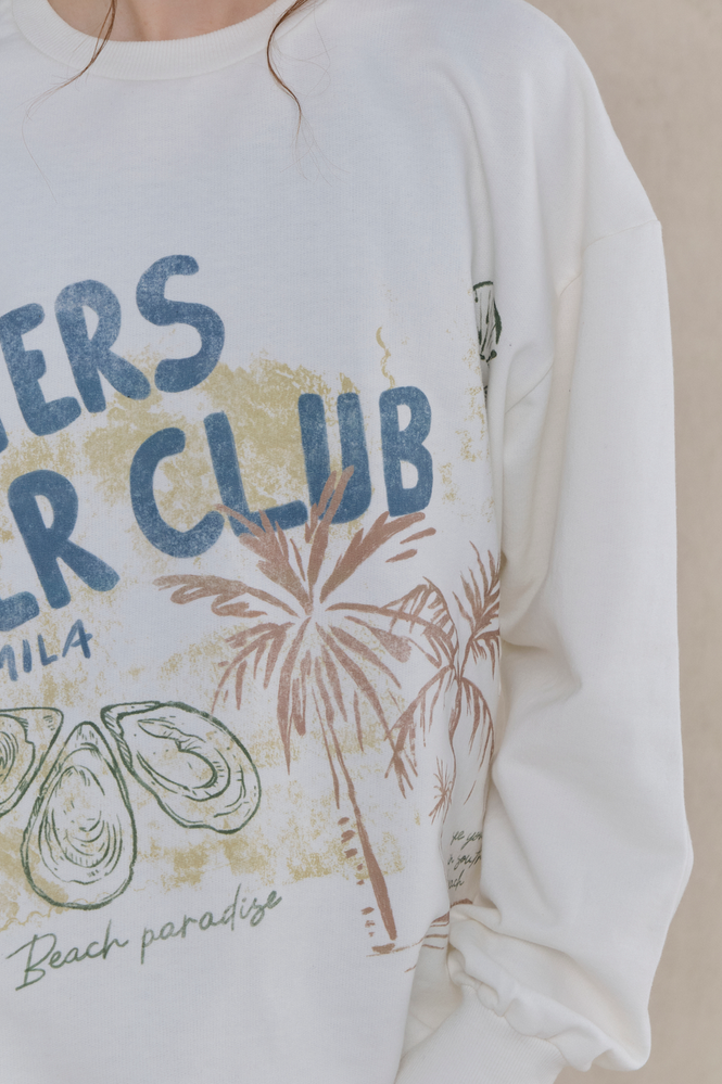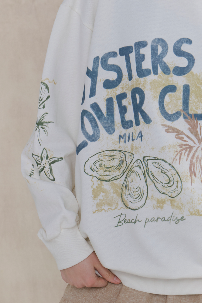 Buzo oversized de escote redondo con estampa exclusiva de la colección OCEÁNICA SS26. Fit relajado para un look cómodo. Composición: 100% algodón