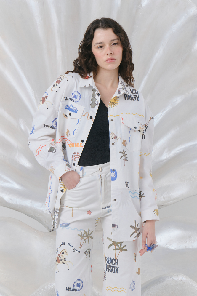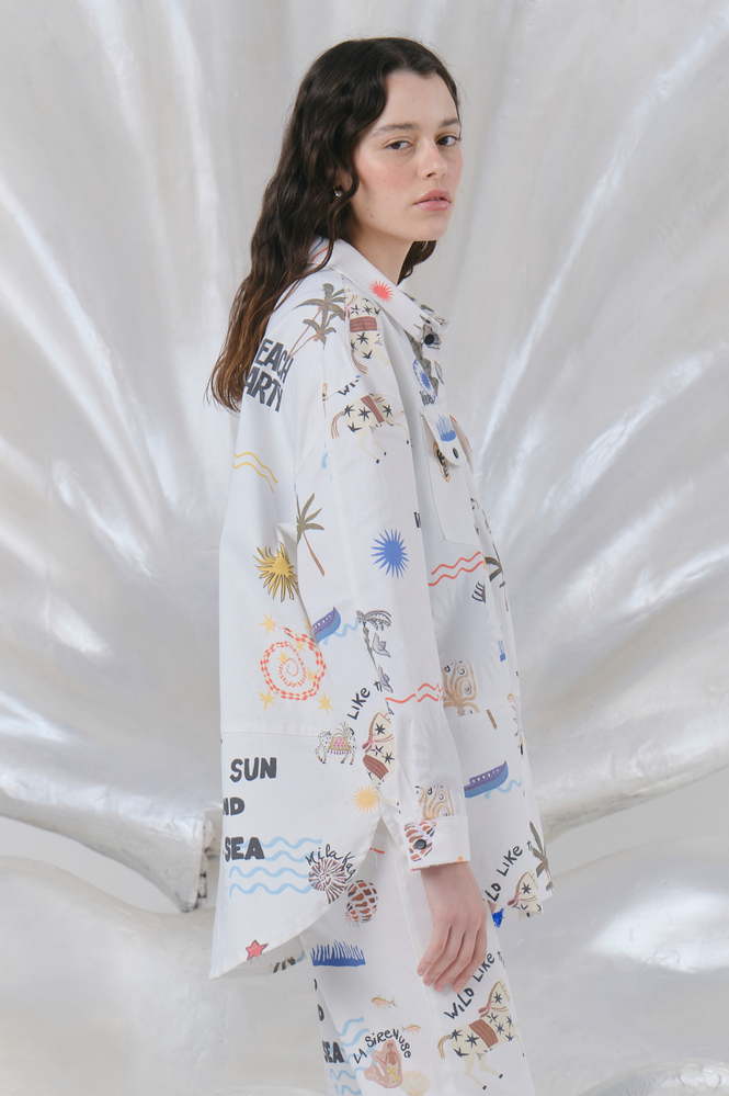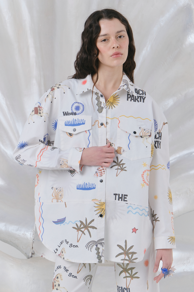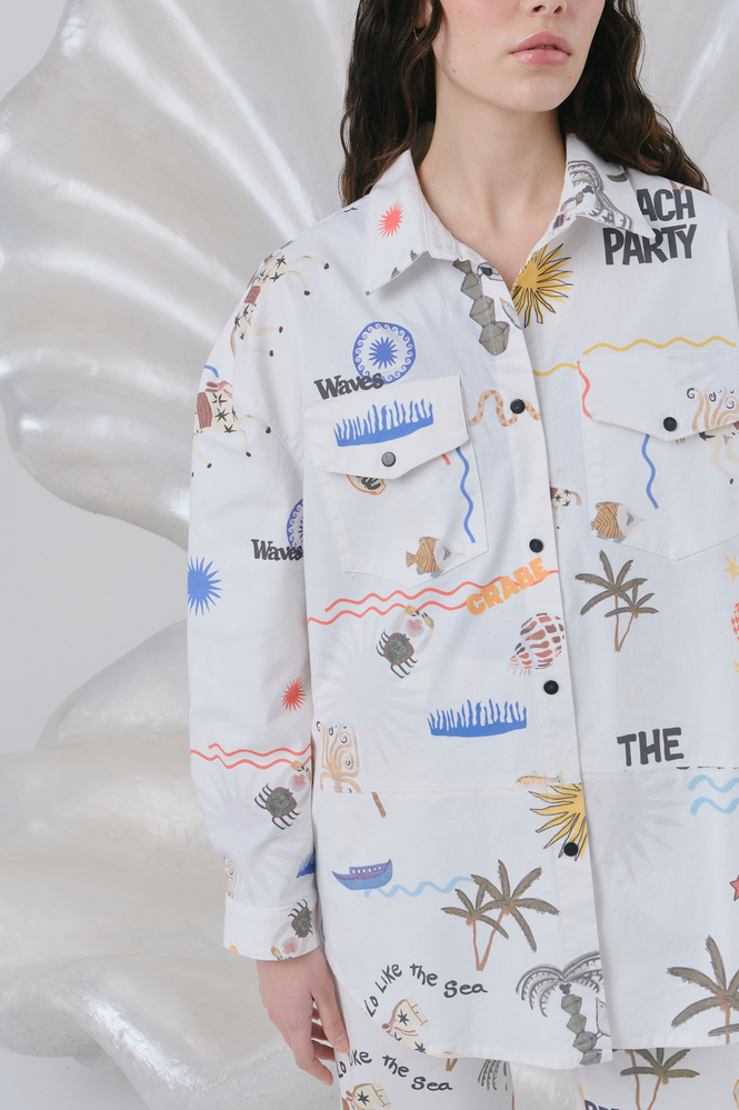 Camisaco con estampa exclusiva de la colección OCEANICA, confeccionado en gabardina con lycra. Posee broche snap negro que contrastan y dan un toque sutil. Fit amplio, talle único. Compuesto por 98% algodón y 2% spandex. Limpieza y Cuidados: lavar a mano con agua fría, secar a la sombra, no blanquear, no retorcer