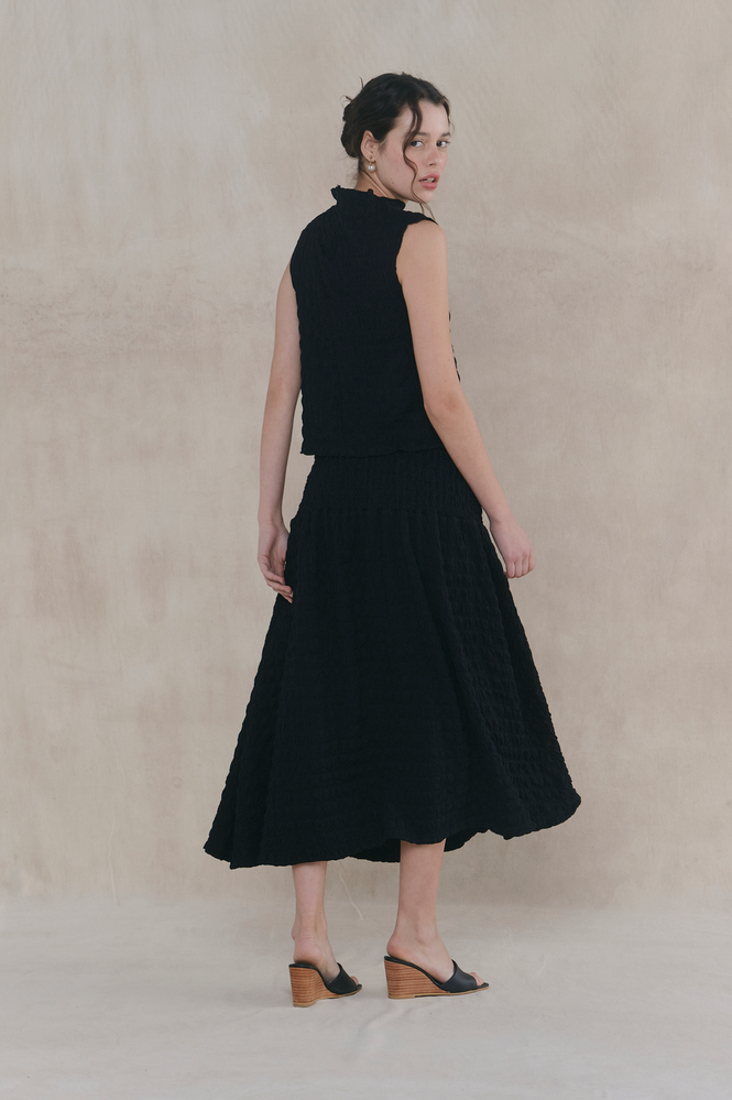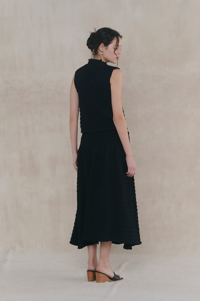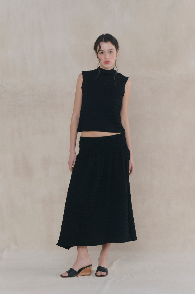 Falda confeccionada en tramado elastizado tipo cloque. Tiro medio y largo midi, cintura elastizada con hilo elástico para mayor comodidad y versatilidad en el calce. Composición: 100% poliéster.