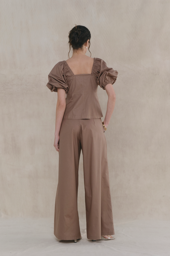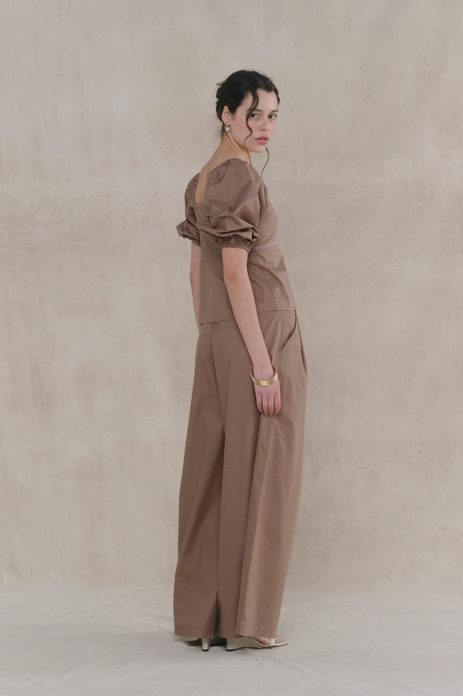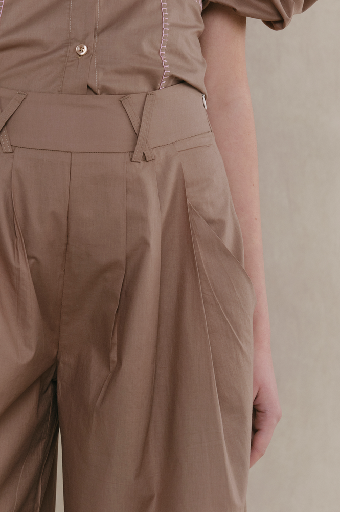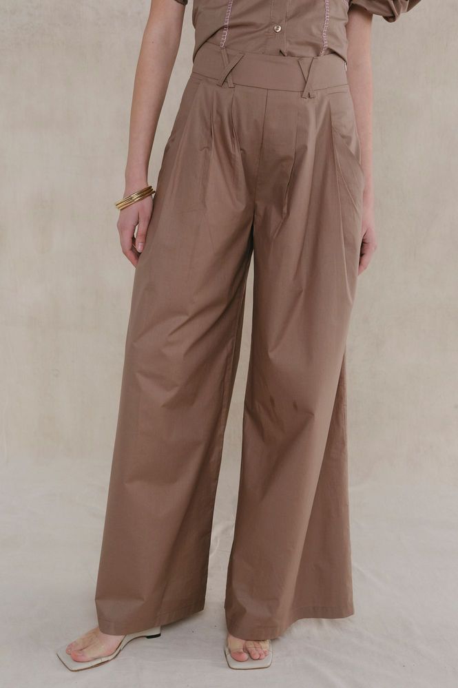 Pantalón ancho con corte a la cintura, detalle de tablas y presillas decorativas. Confeccionado en poplín liviano, lo que lo hace fresco y versátil. Fit semi wide. Composición: 100% algodón.