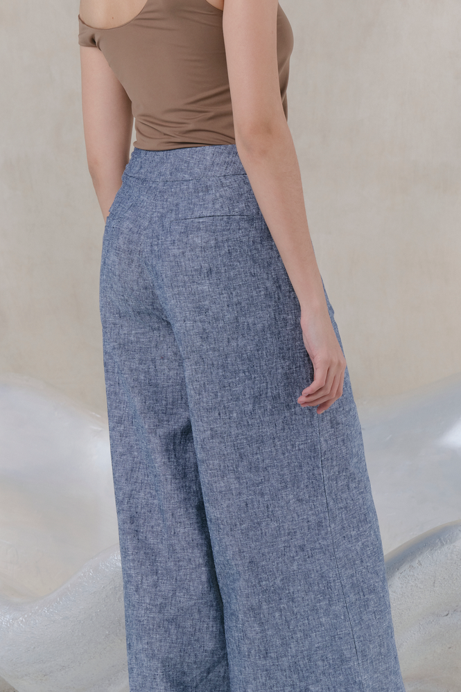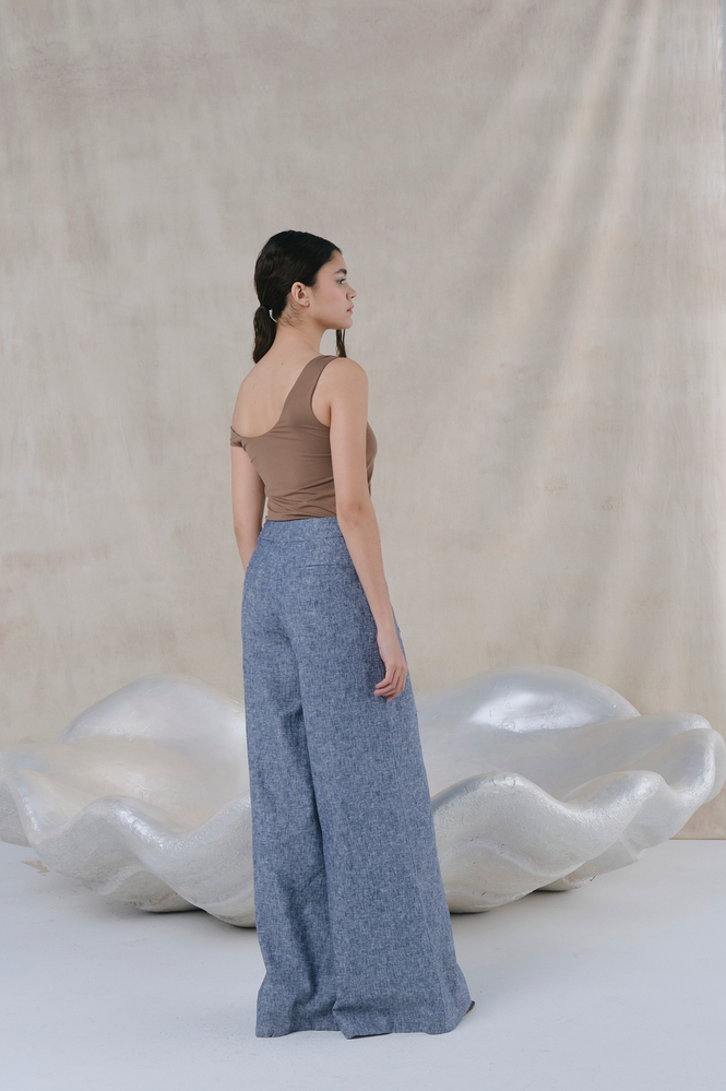 Pantalón de lino con detalle de cintura con lazo y pasaderas metálicas. Fit súper wide y tiro medio. Un ítem atemporal que se ajusta a todos tus looks. Composición: 55% lino, 45% algodón.