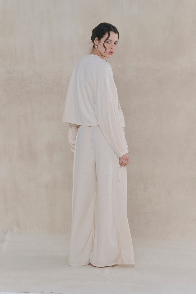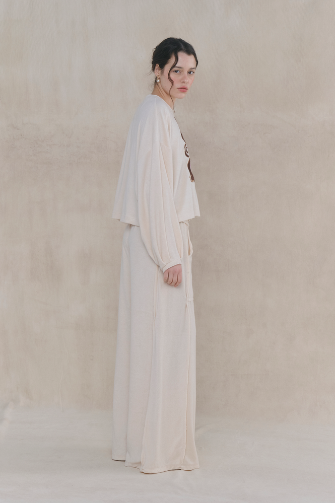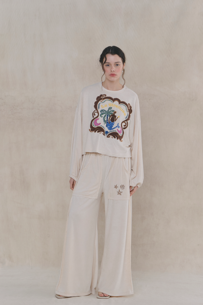 Pantalón con elástico en cintura, confeccionado en rústico tipo toalla. Con recortes laterales que amplían el fit de la pierna para un look relajado. Detalle de bordado exclusivo. Ideal para usar con el Buzo Sirenusse. Composición: 100% algodón.