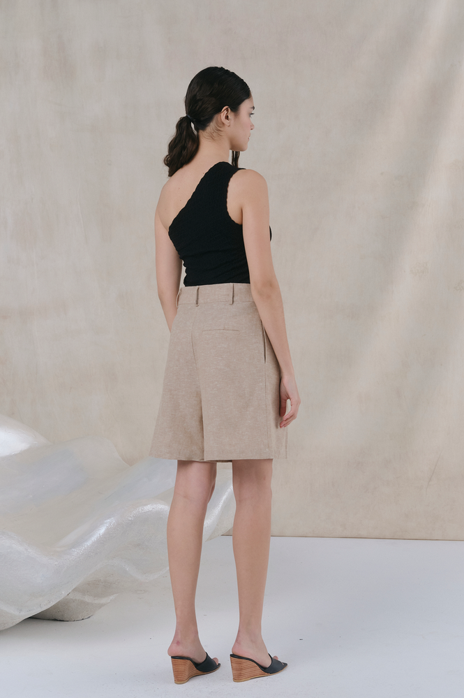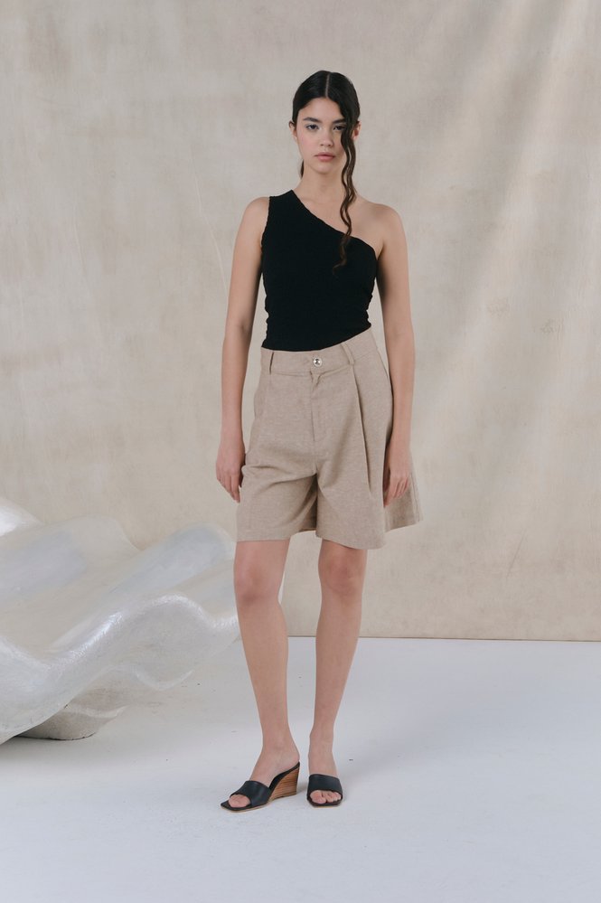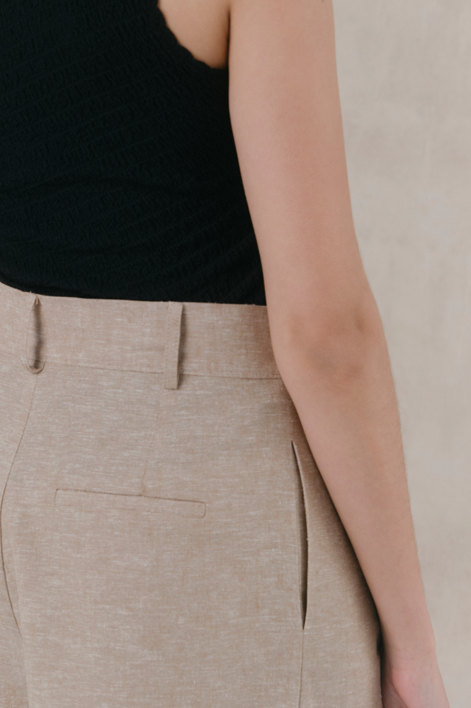 Bermuda de lino con tabla que aporta amplitud y comodidad. Detalle de avío personalizado. Fit a la cintura y largo arriba de rodilla. Un item clásico que se reversiona. Composición: 55% lino, 45% algodón