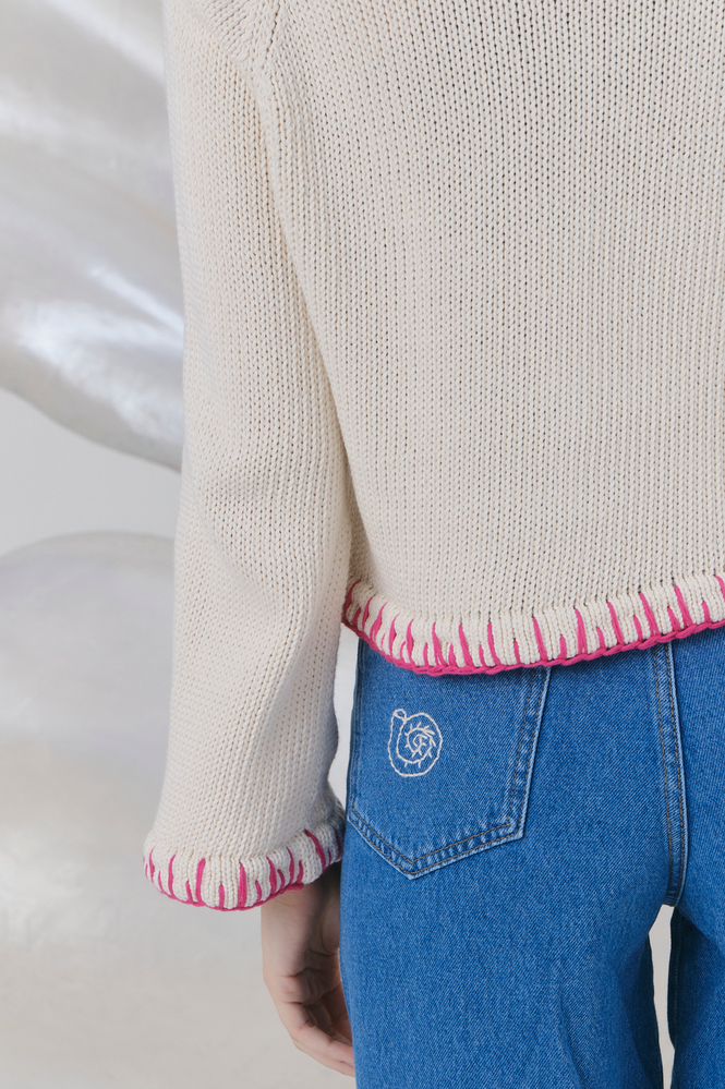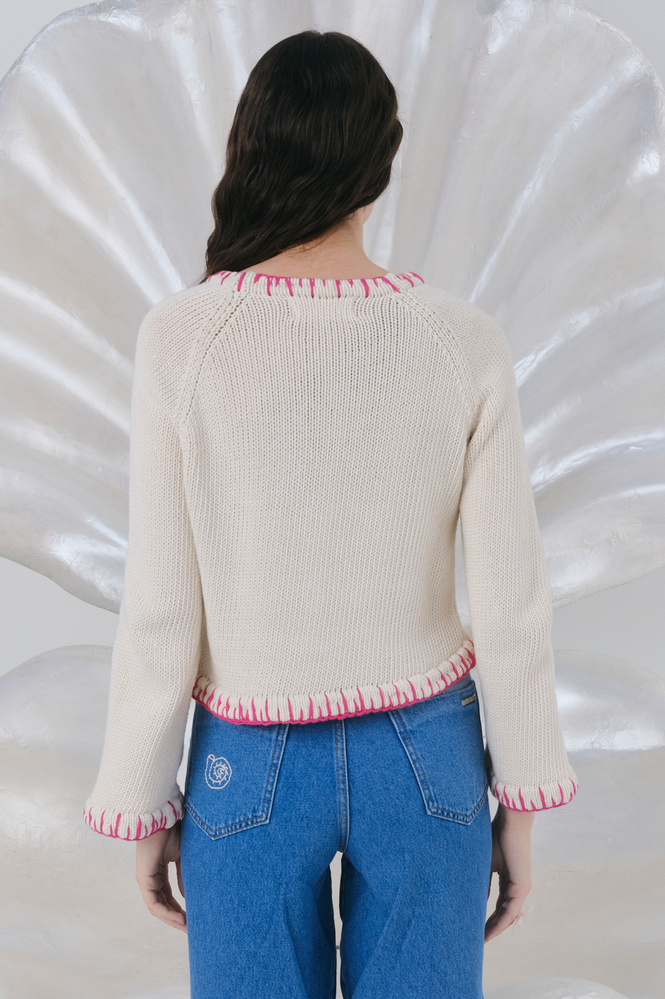 Sweater tejido a mano con cuello redondo y mangas trompeta. Largo a la primer cadera. Posee detalle de bordado central con dibujo exclusivo de esta temporada. Todos los ruedos tienen terminacion de cadeneta a contra tono hecha a mano . Esta prenda esta realizada artesanalmente por lo que pueden variar entre si. "La magia de lo irrepetible". Composición 100% algodón