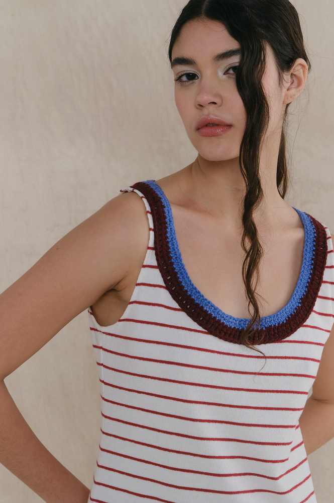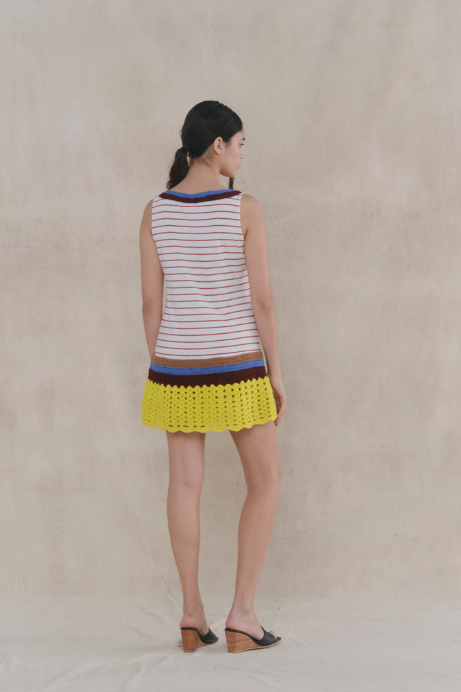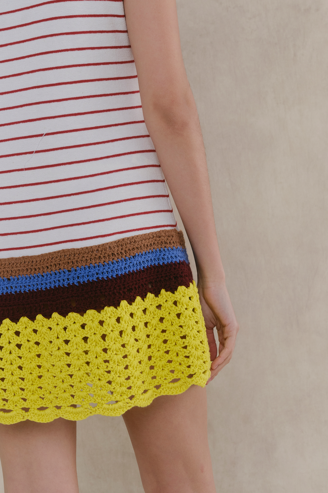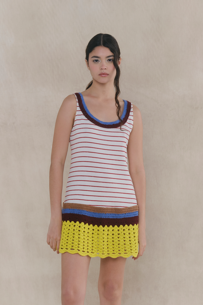 Vestido tipo musculosa confecionada en rústico liviano, posee detalle de faldón, cuello y aplique de caracola tejidos artesanalmente a crochet. Prenda realizada a mano, con variaciones mínimas entre cada una."La magia de lo irrepetible" Composición: 100% algodón