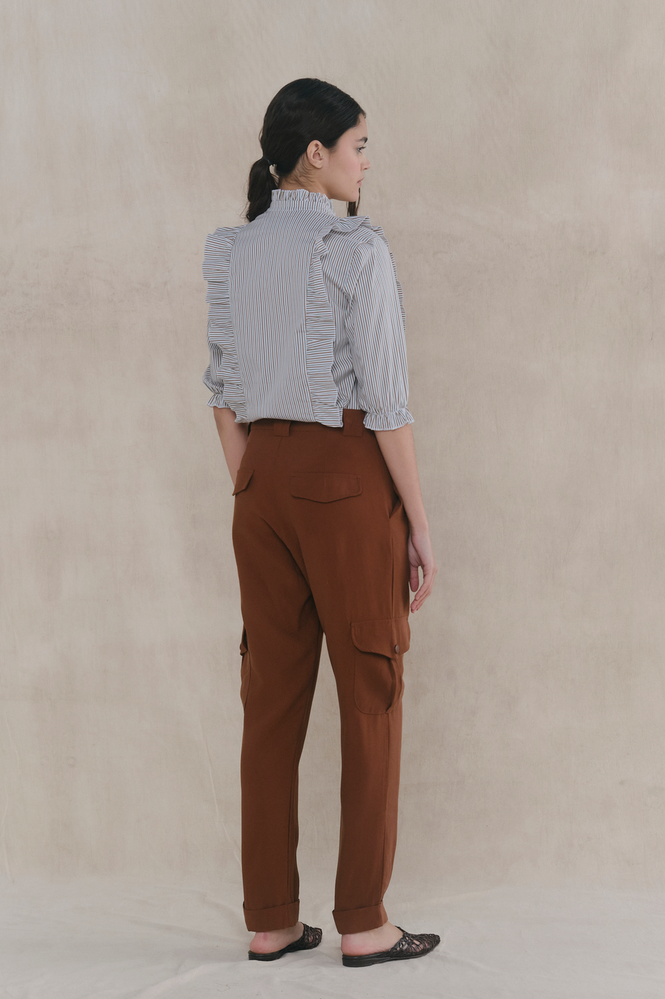 Pantalon tipo cargo práctico y elegante. Confeccionado en twill para una textura resistente y cómoda. Bolsillos laterales con snaps al tono. Posee detalle de bolsillo ojal y presillas destacadas que aportan un toque de estilo. Acceso mediante cierre metálico y snap para un ajuste seguro. Fit recto. Largo al tobillo. Composición 100% rayón. Referencia modelo Jose : Altura: 1,76 cintura 65. Talle 1