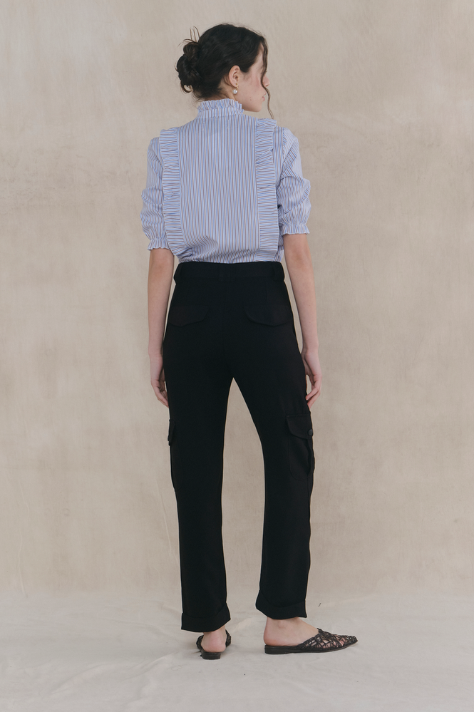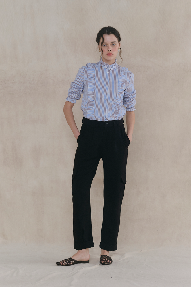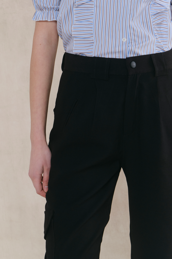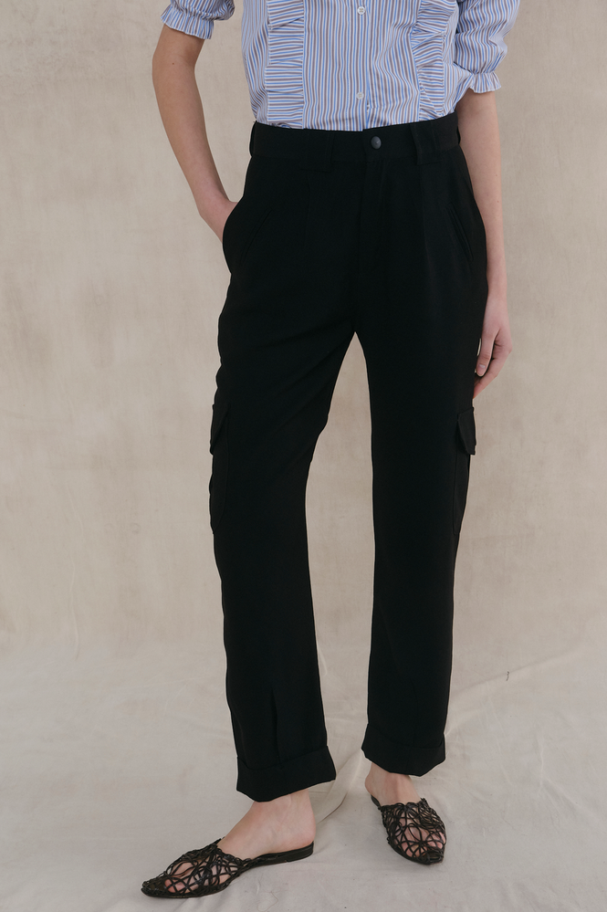 Pantalon tipo cargo práctico y elegante. Confeccionado en twill para una textura resistente y cómoda. Bolsillos laterales con snaps al tono. Posee detalle de bolsillo ojal y presillas destacadas que aportan un toque de estilo. Acceso mediante cierre metálico y snap para un ajuste seguro. Fit recto. Largo al tobillo. Composición 100% rayón. Referencia modelo Jose : Altura: 1,76 cintura 65. Talle 1